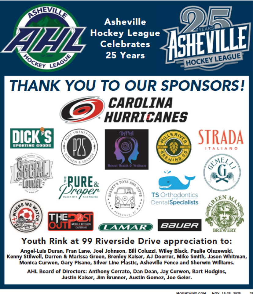 Asheville Hockey releases an ad in the Mountain Xpress thanking donators, sponsors and everyone that helped out with the youth rink at 99 Riverside Drive.